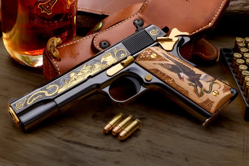 [Мало вам стандартных накладок на рукоятку? Можете заказать и вот такие…Да, но что именно они делают? Помните, мы как-то уже рассказывали о резных, посеребренных и позолоченных ружьях компании Энтони Императо, выпускающего «винчестера» в самом разном оформлении? Так вот, компания Саймона Хиабани ничтоже сумняшеся производит пистолеты «Кольт» образца 1911 года. Вообще американские оружейники проявляют чудеса изобретательности, когда речь заходит о продвижении на внутреннем рынке всевозможных версий легендарной модели «Кольт» M1911 — конкуренция тут очень жёсткая. Но именно Саймон очень ловко ее обошел! Пистолеты «Кольт» в его фирме отделываются гравировкой и золотом, при этом каждая выпущенная ограниченным тиражом модель посвящена какой-то одной исторической теме.