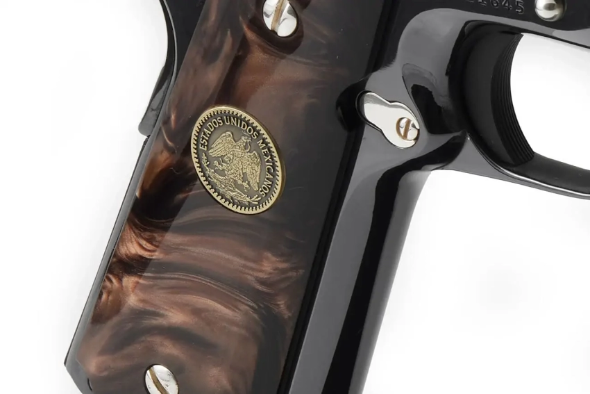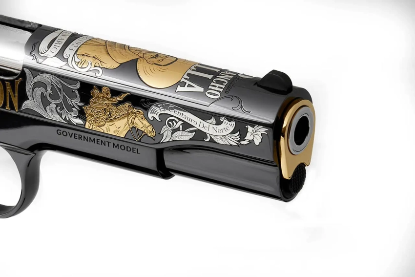 Герб Свободного и суверенного штата Дуранго с выгравированной надписью «Revolución» украшают правую сторону пистолета. В верхней части затвора находится портрет Франсиско Вильи («Панчо» — это было его прозвище, — прим. автора), а рядом с окном выброса гильз виден его патронташ с патронами калибра .30–30. На целике изображён герб Мексики (1899 — 1917). Пистолет доведён до совершенства полированной рамкой, затвором, стволом и фурнитурой с селективным серебряным и золотым напылением на затворе. Пистолет отличается и новой рукояткой, накладки на которую украшены изготовленными на заказ копиями старинных золотых монет песо.