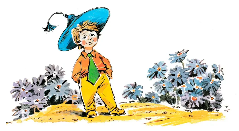 Но самым известным среди них был малыш, по имени Незнайка. Его прозвали Незнайкой за то, что он ничего не знал. Этот Незнайка носил яркую голубую шляпу, жёлтые, канареечные, брюки и оранжевую рубашку с зелёным галстуком. Он вообще любил яркие краски. Нарядившись таким попугаем, Незнайка по целым дням слонялся по городу, сочинял разные небылицы и всем рассказывал. Кроме того, он постоянно обижал малышек. Поэтому малышки, завидев издали его оранжевую рубашку, сейчас же поворачивали в обратную сторону и прятались по домам.
