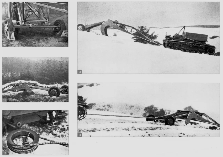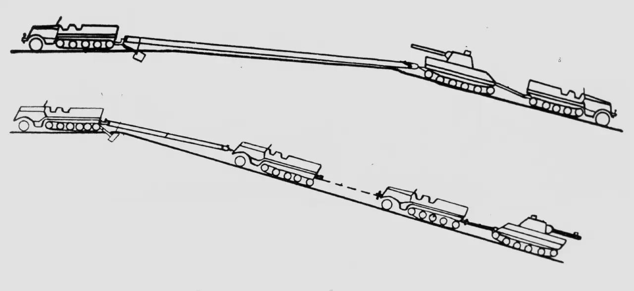 Руководство также показывало, что звёздочка танка могла служить лебёдкой. Гусеницы расцеплялись над звёздочкой, которая затем сбрасывалась задним ходом. Трос можно было обматывать вокруг звёздочки для эвакуации других танков. Военнопленный (лейтенант батареи учебно-артиллерийского запасного батальона, захваченный в Тунисе в мае 1943 года) заявил, что на твёрдых дорожных покрытиях любой колёсно-гусеничный тягач мог буксировать на значительные расстояния (не менее 100 км) в три раза больше веса, для которого он был предназначен. Например, 3-тонный Sd.Kfz. 11 мог буксировать 9 тонн и т. д. Для пересечённой местности одна треть доступной мощности тягача должна всегда оставаться в резерве. Таким образом, лёгкая полковая гаубица весом около 1930 кг буксируется 3-тонным тягачом, а тяжёлая полковая гаубица весом около 5 тонн — 8-тонным.
