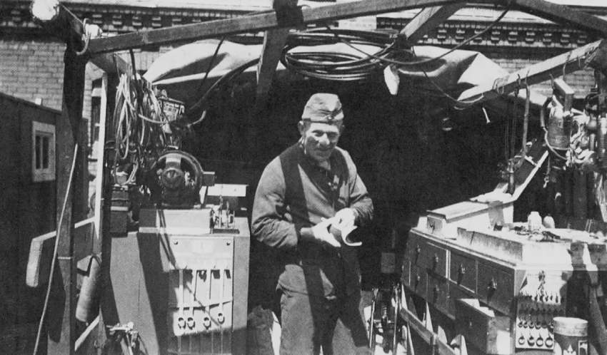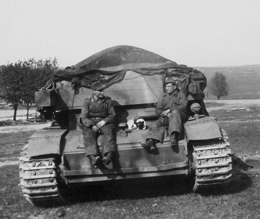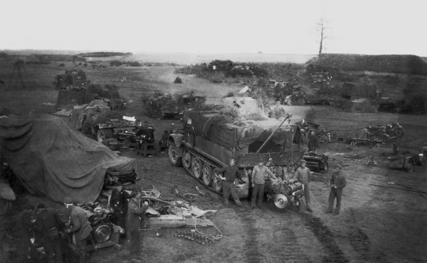 Ремонтный взвод восстанавливает замаскированный танк. На переднем плане 18-тонный тягач