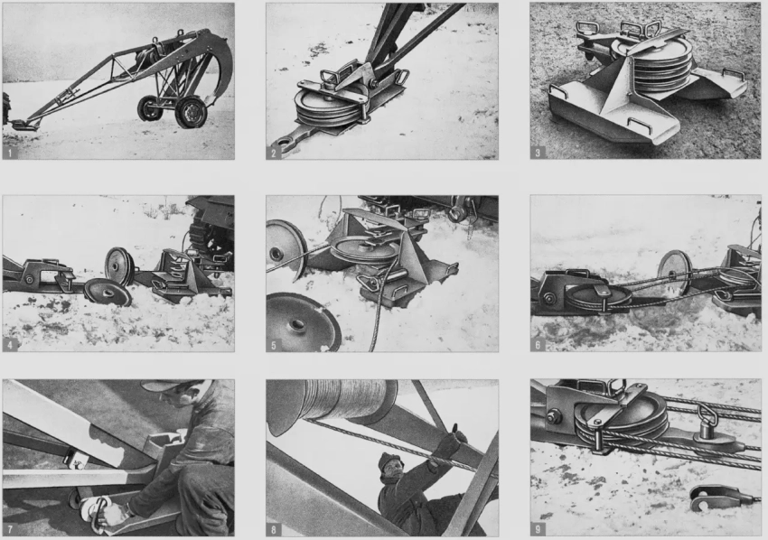 Приспособления для эвакуации БРЭМ «Бергенпантера». 1. Бергенанкер. 2. Анкер с полиспастом. 3. Полиспаст на полозьях. 4. Часть анкера с полиспастами. 5-9. Иллюстрация для руководства по сборке эвакуационного узла. 10. Каретка бергенанкера. 11. Анкер в грунте. 12. Изображение правильной фиксации троса. 13. Бергенанкер на склоне. 14. Извлечение бергенанкера.