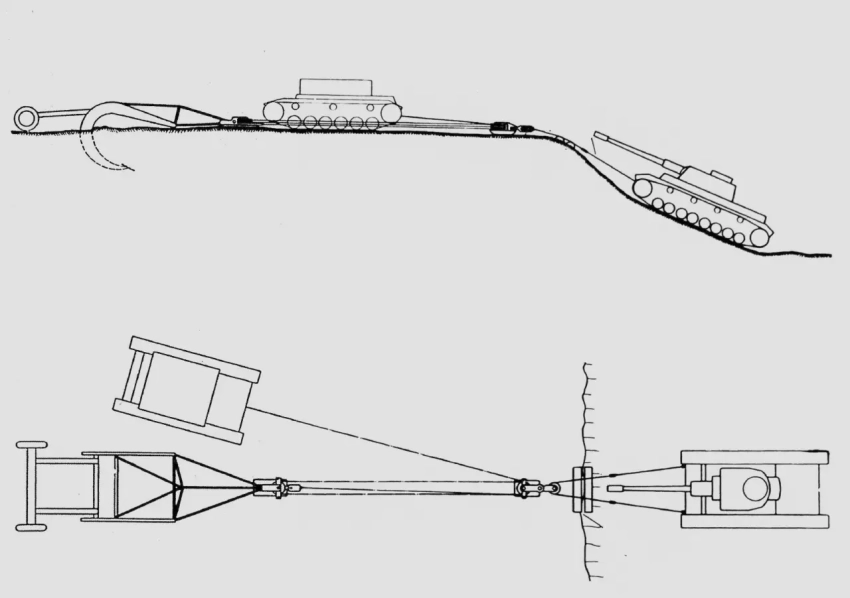 Схемы использования экспериментального устройства «Бергенанкер», позволяющего эвакуировать самые тяжелые немецкие танки сравнительно легкой БРЭМ.