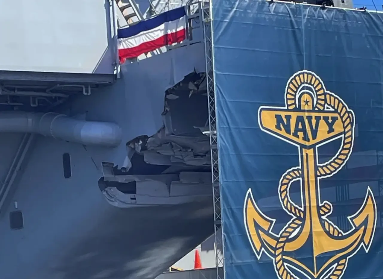 В итоге к настоящему моменту проблему решили «дёшево и сердито»: место повреждения покрасили, те листы металла, которые были фактически разорваны, кое-как прикрепили обратно к корпусу, «лишнее» отрезали, и в конечном итоге – всё просто закрыли флагом ВМС США. Причём «для надёжности» флаг насадили на металлическую раму – чтобы «не сдувало» ветром и не открывалась прежняя дыра в корпусе авианосца.