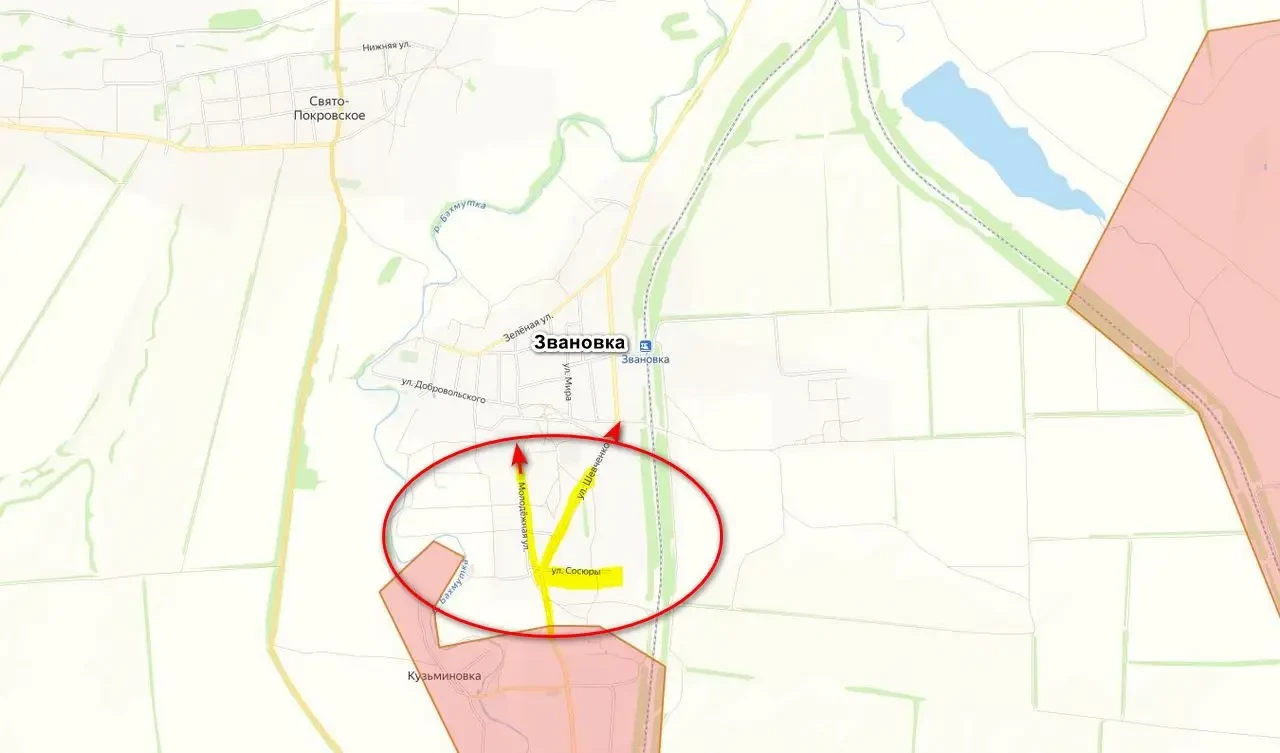 Подтверждается ранее опубликованная информация о заходе штурмовых групп ВС РФ в Звановку. Малые маневренные группы уже во всю разворачиваются на территории южной части населенного пункта. Согласно полученным военным экспертом Андреем Марочко данным, наши на трех улицах: Сосюры, Шевченко и Молодежной, где идут активные бои.