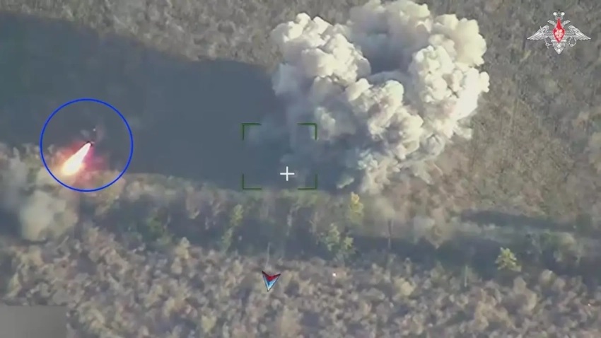 Поражение цели. Облако пыли справа — результат подрыва ракеты «Искандер-М». Слева видно нештатное срабатывание двигателя ракеты «Нептун» от поражения осколками. Фото Минобороны РФ