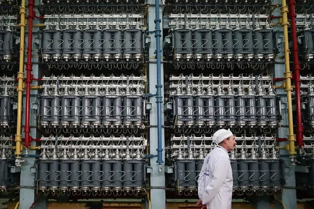 Дальше уран надо обогатить до приемлемого для АЭС уровня. И вот там начинается технологическая магия. Обогащение требует, чтобы уран перевели в газообразную форму, и закись-окись урана преобразуется в гексафторид урана (UF6). Гексафторид урана подается в центрифуги с тысячами быстро вращающихся вертикальных трубок, которые отделяют уран-235 от несколько более тяжелого изотопа — урана-238. Центрифуги также разделяют уран на два потока: один содержит обогащенный уран-235, другой — уран-235 более низкой концентрации. Как есть – магия, потому что каждый может посмотреть, сколько весят три протона, обуславливающие разницу между уранами 235 и 238, и понять происходящее. Но факт, крутящиеся цилиндрики разделяют изотопы так, что уран-235 может достичь степени обогащения до 90%.