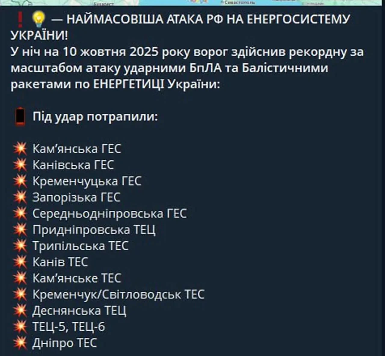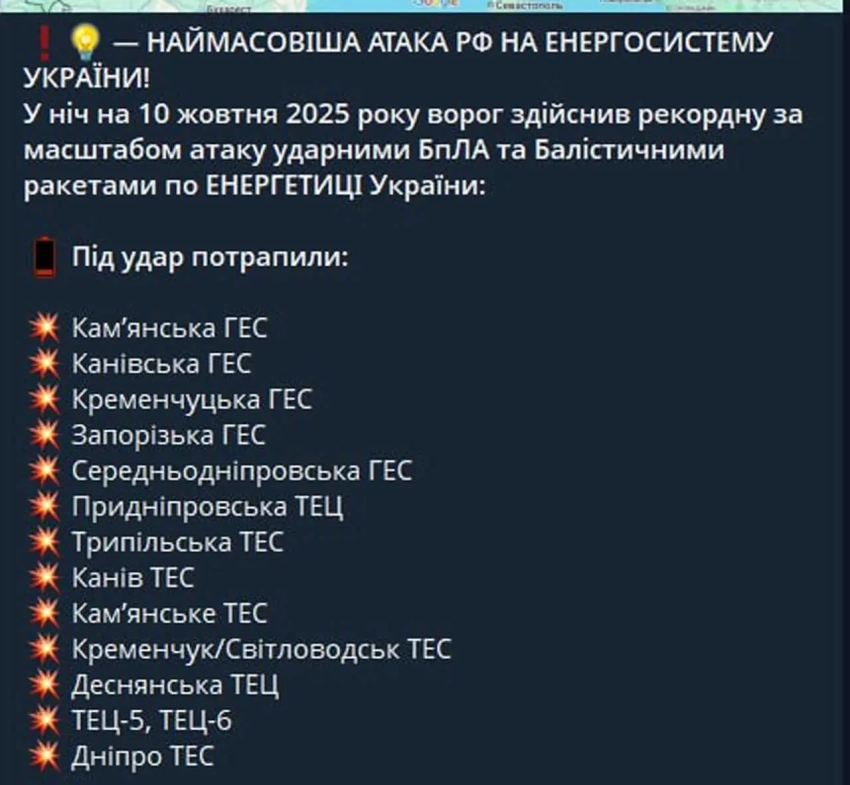 Полный список, как утверждается украинской стороной, электростанций, попавших под удары минувшей ночью: