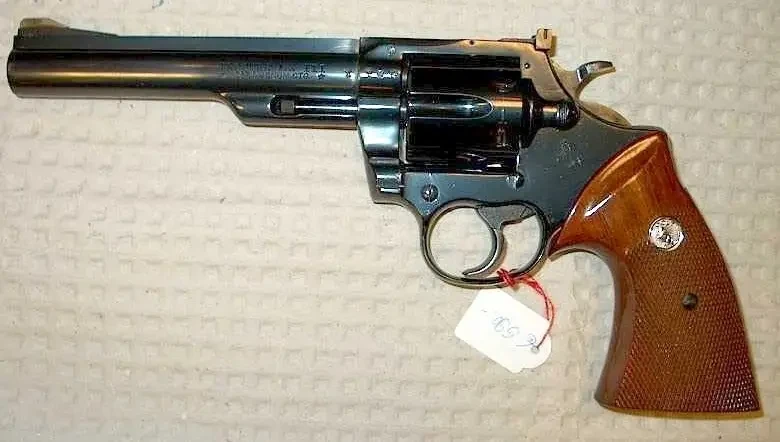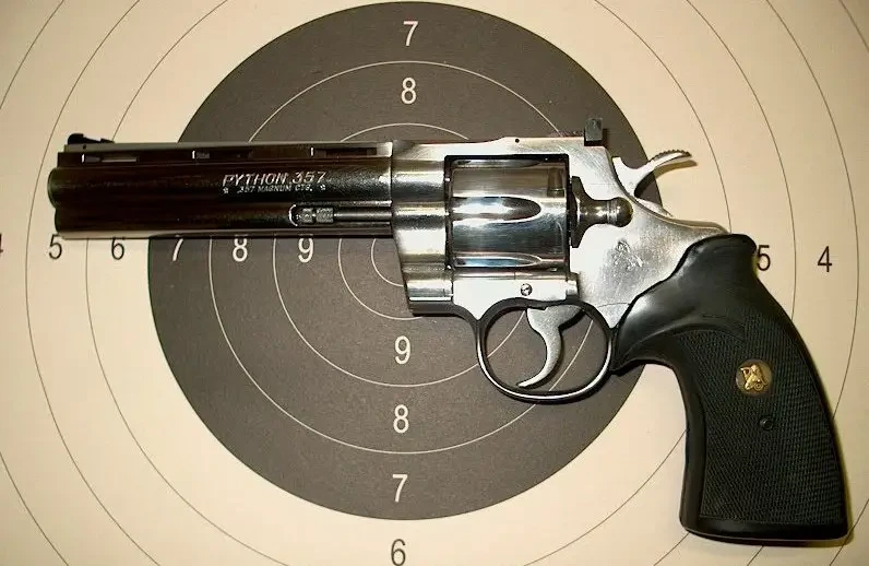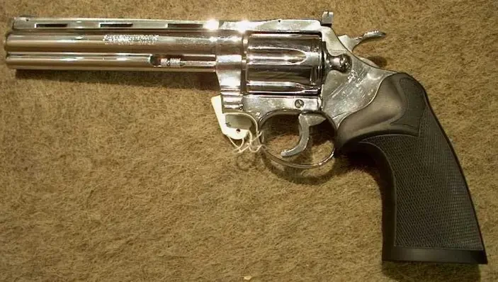 А в 1955 году был выпущен очень мощный револьвер «Кольт Питон» с ударно-спусковым механизмом двойного действия, под патрон калибра .357 Магнум. Это 9-мм патрон большой мощности, потребовавший увеличения размеров оружия. Поэтому неудивительно, что этот револьвер стал одним из самых харизматичных американских револьверов, и также одним из наиболее известных револьверов, которые когда-либо производились фирмой «Кольт». У него красивый и лаконичный дизайн и плюс высокое качество изготовления – вот он и занял на рынке устойчивую нишу. К числу заметных особенностей этого револьвера относится и «вентилируемая планка» над стволом, и кожух для стержня экстрактора, который под стволом идет вплоть до самого дульного среза. Покрытие – воронение или никелирование. «Щёчки» на рукоятке из древесины ценных пород.