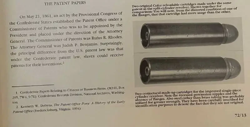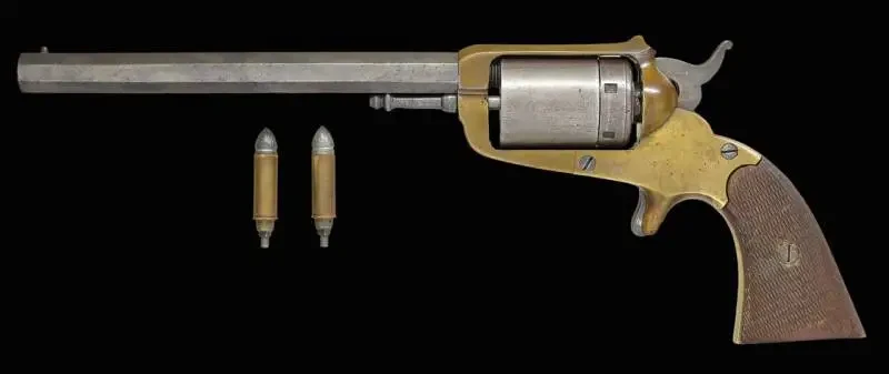Револьвер Кофера, тип I вместе с его патронами. Фотография из книги «Длинноствольное оружие и пистолеты конфедератов»