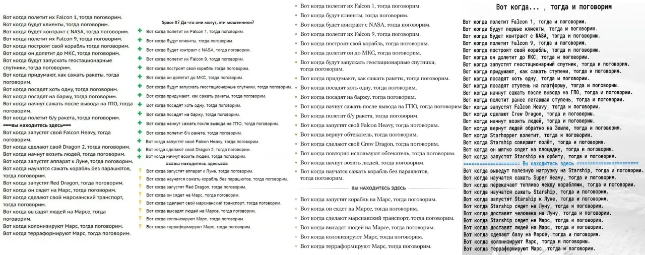 Помнится, лет 15 тому назад мне попалась статья некоего «эксперта с опытом работы в космической сфере», который заявлял, что ничего у Илона Маска с ракетой Falcon не получится: не то соотношение габаритов ступеней, корпус слишком тонкий — переломится при посадке, и так далее, и тому подобное. К сожалению, тогда эту статью не сохранил, а теперь не получается её найти — скорее всего, «эксперт» её попросту удалил.