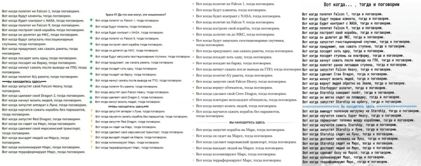 А ещё очень широко было распространено два мнения: первое, что Илон Маск всё украл, наследие Советского Союза у России, дескать, именно за этим он сюда и приезжал, и второе, что бизнес компании SpaceX не был бы успешным без господдержки США.