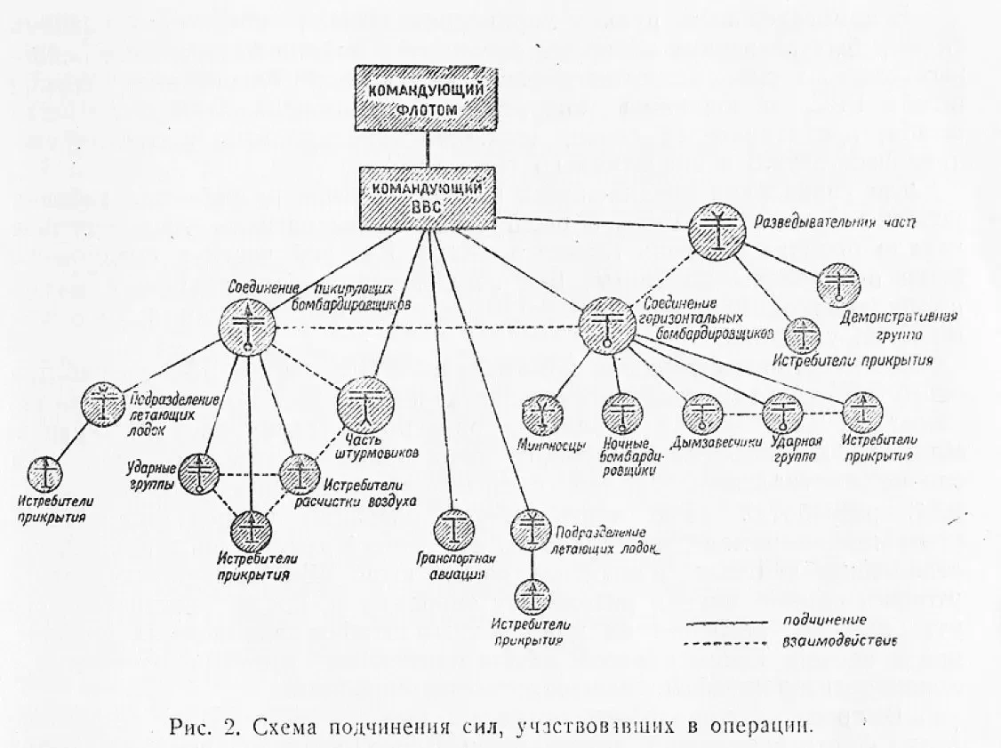Главный удар нанести внезапно, в утренние часы, по истечении пяти суток от начала операции, массируя действия в самый непродолжительный период времени. Удар главных сил — пикирующего бомбардировочного соединения и соединения горизонтальных бомбардировщиков — должен был быть нанесен в течение 30-40 минут с разных направлений и высот, с задачей уничтожения эскадренных миноносцев и баз подводных лодок. Удар главных сил обеспечить ослеплением зенитных батарей и подавлением истребителей противника как в воздухе, так и на земле (рис. 1).