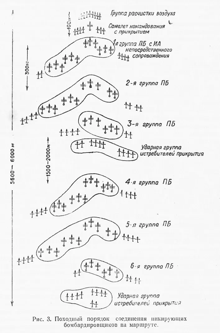 Боевой порядок шестерок — колонна звеньев. Звенья — в строю левой змейки. Дистанция между самолетами — 100-150 м. Пикирование по цели — непрерывным потоком одиночными самолетами («цепочкой»).