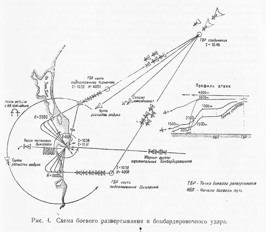 Бомбардировочный удар части пикирующих бомбардировщиков подполковника Цицорина. В 10 час. 56 мин. часть произвела боевое развертывание. Учитывая, что часть наносит удар во втором эшелоне, было заранее предусмотрено, что самолеты могут достигнуть внезапности только при выполнении маневра выхода на цель со стороны солнца, почему направление атаки было избрано с юго-западного и южного секторов.