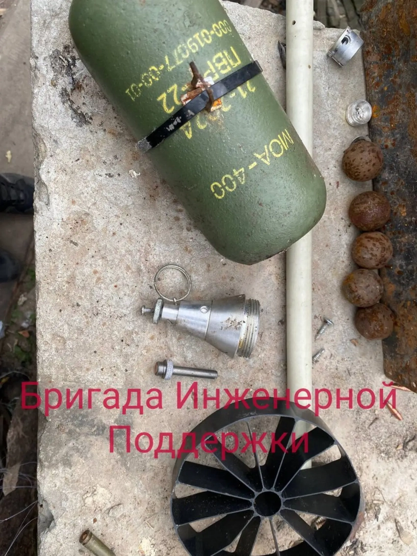 Для сброса с дрона в мину вставляется так называемый хвостовик, состоящий из деревянной рукоятки и пластмассовых направляющих, задачей которых держать мину взрывателем вниз. Однако, как отмечают наши бойцы, во многих случаях мина просто не срабатывает из-за конструкции взрывателя. Он часто отваливается от удара об землю.