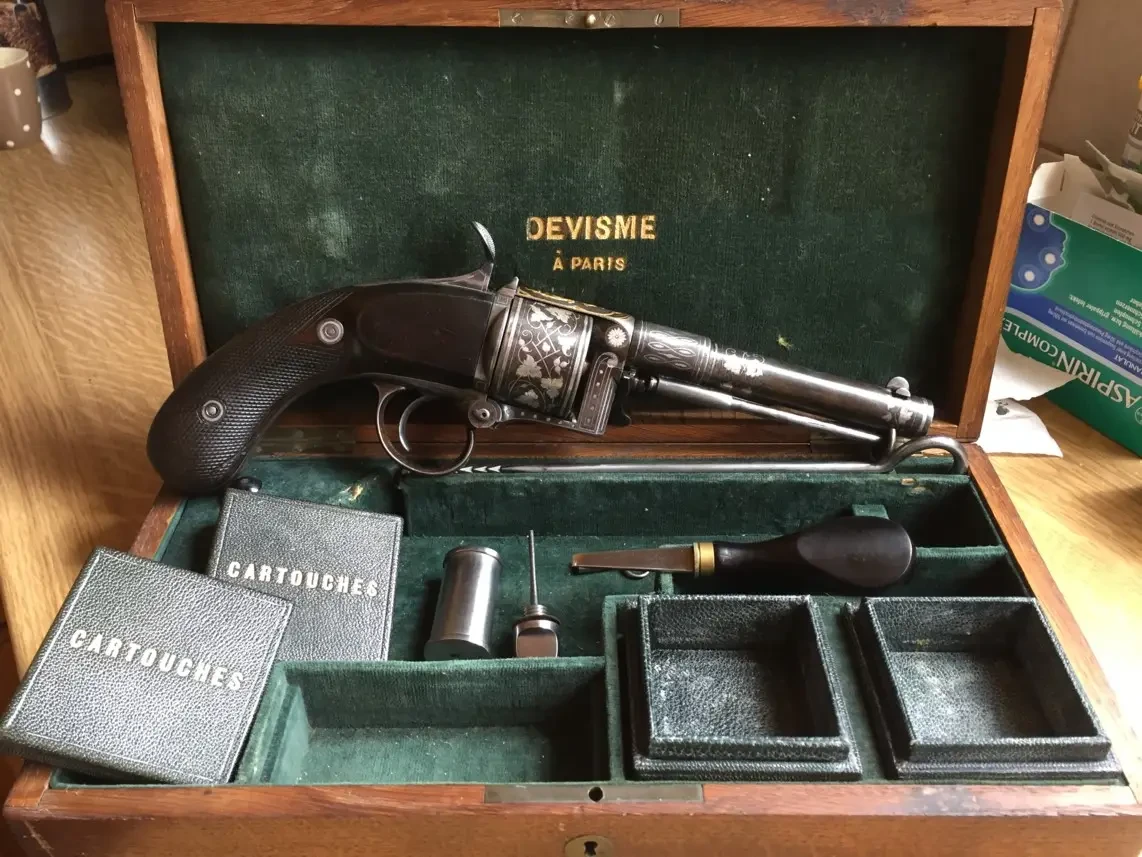 Так, компания Девисма Жана-Луи Франсуа уже к 1858 году перешла на практичные патроны центрального воспламенения и была достаточно уверена в их эффективности, чтобы конверсировать под них свои ранние ударно-капсюльные револьверы M1854. Это решение оказалось верным, и вскоре компания представила новый револьвер с шарнирной рамкой, с которым было проще обращаться. Калибр составлял 12 мм. И револьверы 1854, и револьверы 1858 года отличались характерным эргономичным французским стилем.