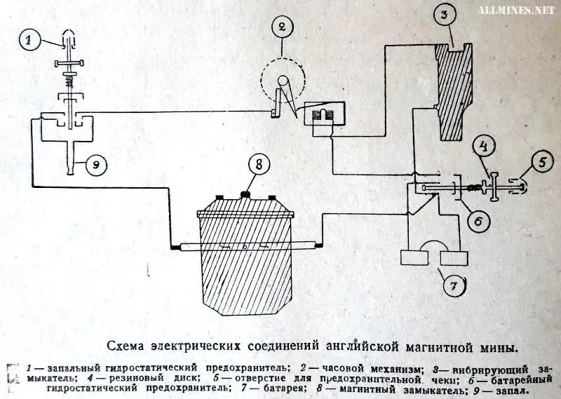 Электрическая схема английская магнитной донной мины, примененной на Северной Двине в 1919 г.