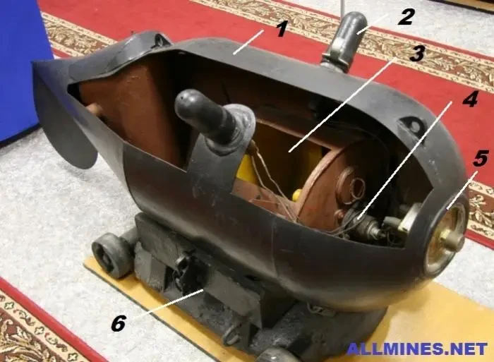 Мина Р-1: 1 – корпус мины; 2 – гальваноударный колпак (2); 3 – заряд ВВ; 4 – запал; 5 – предохранительный прибор; 6 – якорь
