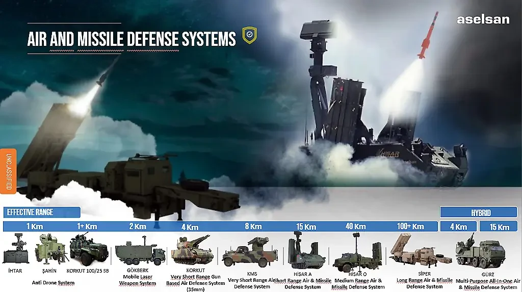 Огневые средства делятся на несколько эшелонов. За дальний перехват отвечает ЗРК Siper. Его базовая версия имеет дальность пуска 100 км, а после модернизации этот параметр доведут до 150 км. Также имеется несколько систем средней и малой дальности, которые будут перехватывать цели в радиусе десятков километров.