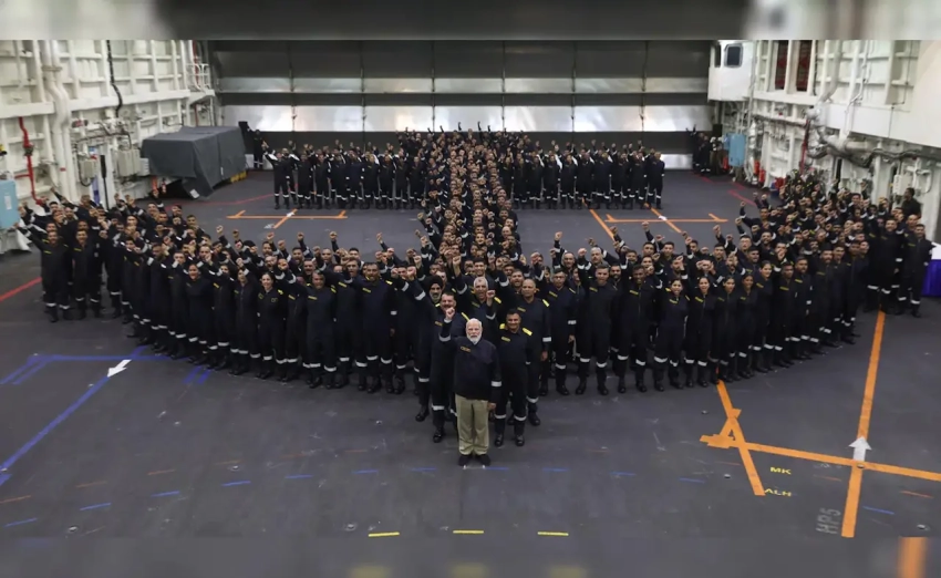 Затем индийский премьер сфотографировался вместе с экипажем авианосца. В составе команды «Викранта» есть и военнослужащие-женщины. Моряки устроили перформанс, выстроившись в фигуру, повторяющую контуры якоря. Нарендру Моди поставили в «остриё».