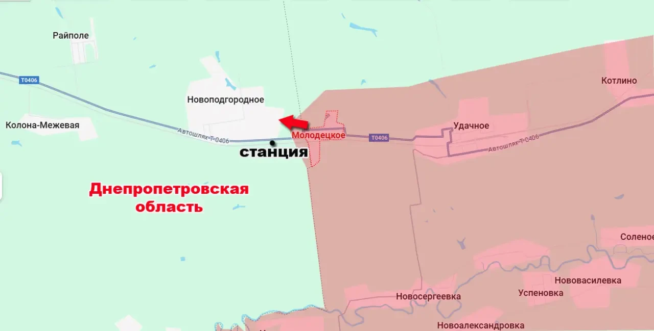 Российские войска вошли на территорию Днепропетровской области ещё на одном участке. Этот участок расположен западнее села Молодецкое (переименованное киевским режимом Ленино). Молодецкое, что на западе ДНР, было полностью освобождено на этой неделе нашими войсками, после чего началось продвижение в направлении днепропетровского села Новоподгородное.