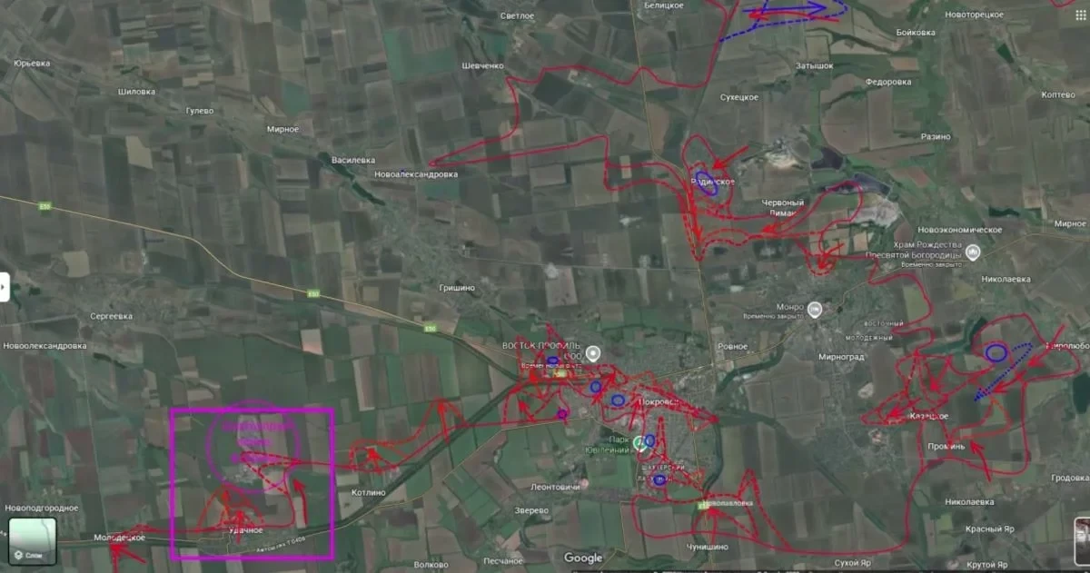 Основные события разворачиваются вокруг Покровской агломерации. Как отмечает Подоляка, оборона противника в самом Покровске, достигнув определенного предела, "начала сыпаться", что привело к быстрой "просадке" фронта.