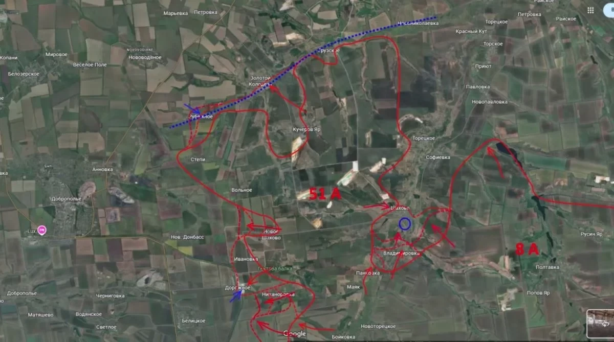 На так называемом Добропольском выступе российские войска продолжают давить противника в районе Шахово. Большая часть этого села уже под контролем ВС РФ, идет дожатие остатков гарнизона ВСУ в южной части.