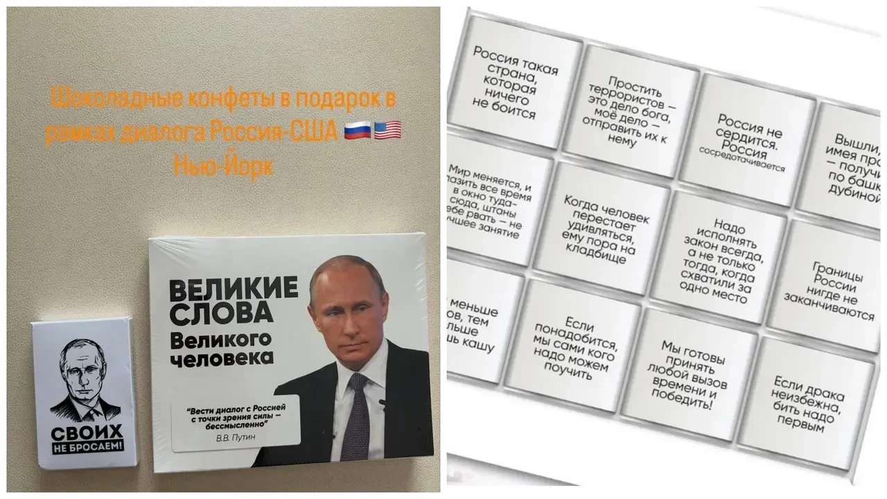 Ранее сообщалось, что Дмитриев привез в США шоколадные конфеты с цитатами Владимира Путина. Это для американцев, чтобы лучше понимали российского президента.