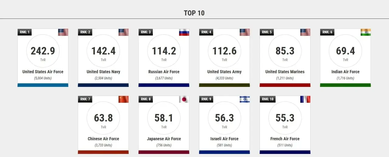 На первом месте аналитики разместили ВВС США с показателем TVR в 242,9 пункта, на втором – ВМС США (TVR 142,4). Россия заняла с большим отрывом третью позицию, набрав 114,2 пункта. На четвёртой и пятой строчках расположились авиация армии США и американских морпехов (112,6 и 85,3). Индия разместилась на пятом месте (69,4), немного опережая Китай (TVR 63,8). Далее следуют Япония, Израиль и Франция.