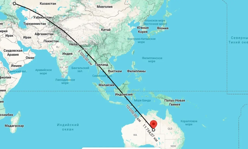 от Капустина Яра до американского радара спутниковой разведки в Алис-Спрингс – 11800 км, а если, например, вести отчёт от базы ТОФ ВМФ России, то расстояние это уменьшается до 7400 км.
