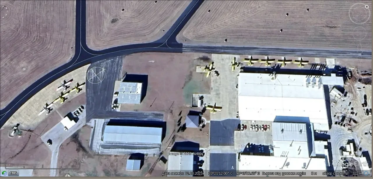 Спутниковый снимок Google Earth: самолёты AT-802 на предприятии Air Tractor в Олни. Снимок сделан в декабре 2023 года