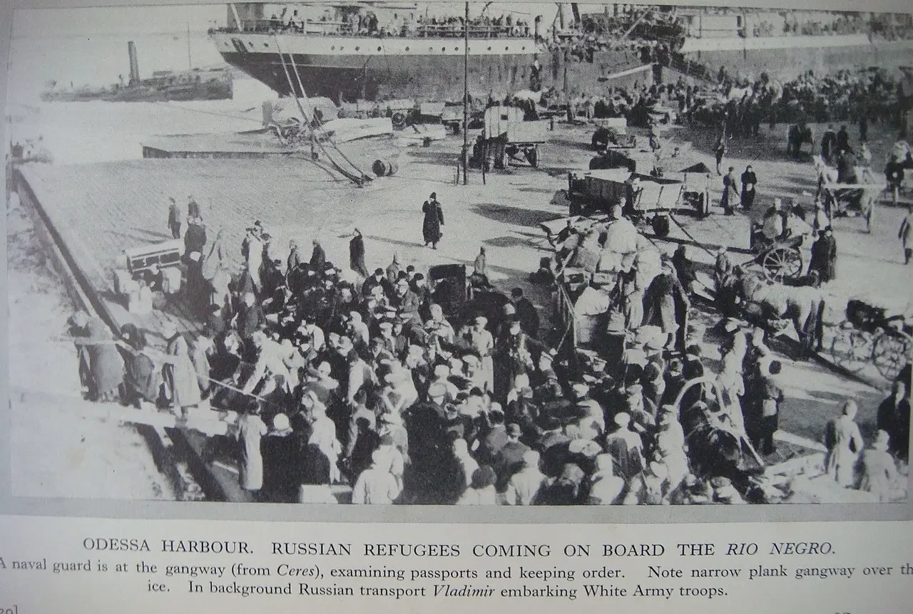 Одесса, посадка на британский транспортный корабль «Rio Negro» (доставил в Салоники около 1400 гражданских лиц, раненых офицеров, а также юнкеров Донского и Сергиевского артиллерийского училищ, кадетов Одесского кадетского корпуса)