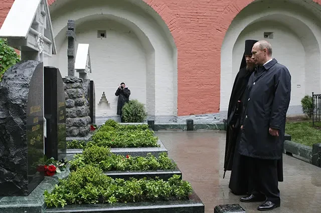 В. Путин на кладбище Донского монастыря возлагает цветы к могиле Деникина, фото РИА Новости