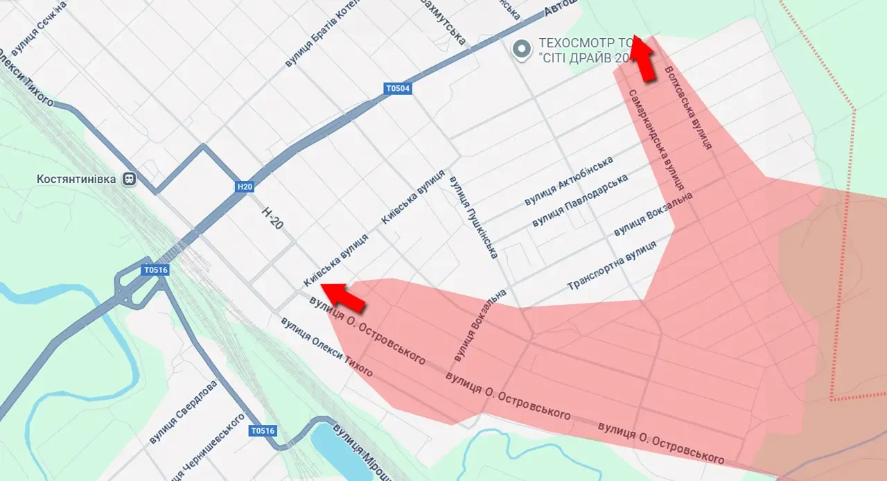 Сегодня российские войска, преодолев ещё около 700 м жилой застройки, прошли практически всю улицу Александра Островского. Бои идут в 400 м от крупной и основной транспортной развязки города, близ которой располагается константиновская металлобаза, территория которой активно используется ВСУ.