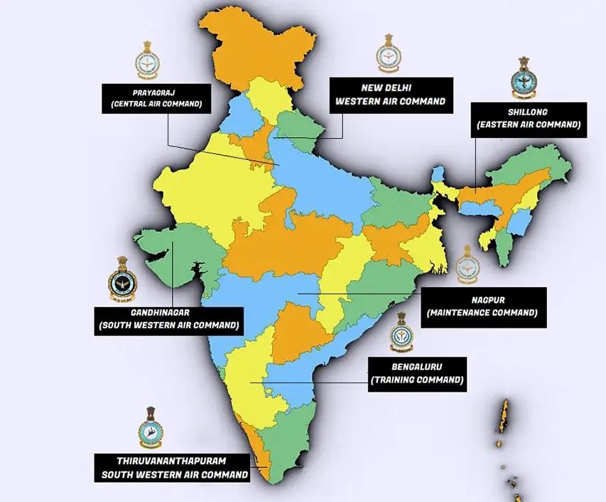 Вся территория Индии разбита на пять командований, контролирующих свою зону ответственности. Штаб Центрального авиационного командования находится в Праяградже, штат Уттар-Прадеш, Восточного командования – в Шиллонге, штат Меглахая, Южного командования – в Тируванантапураме, штат Керала на юго-востоке страны, Юго-Западного командования – в Гандинагаре, штат Гуджарат, Западного командования – в столице Нью-Дели.
