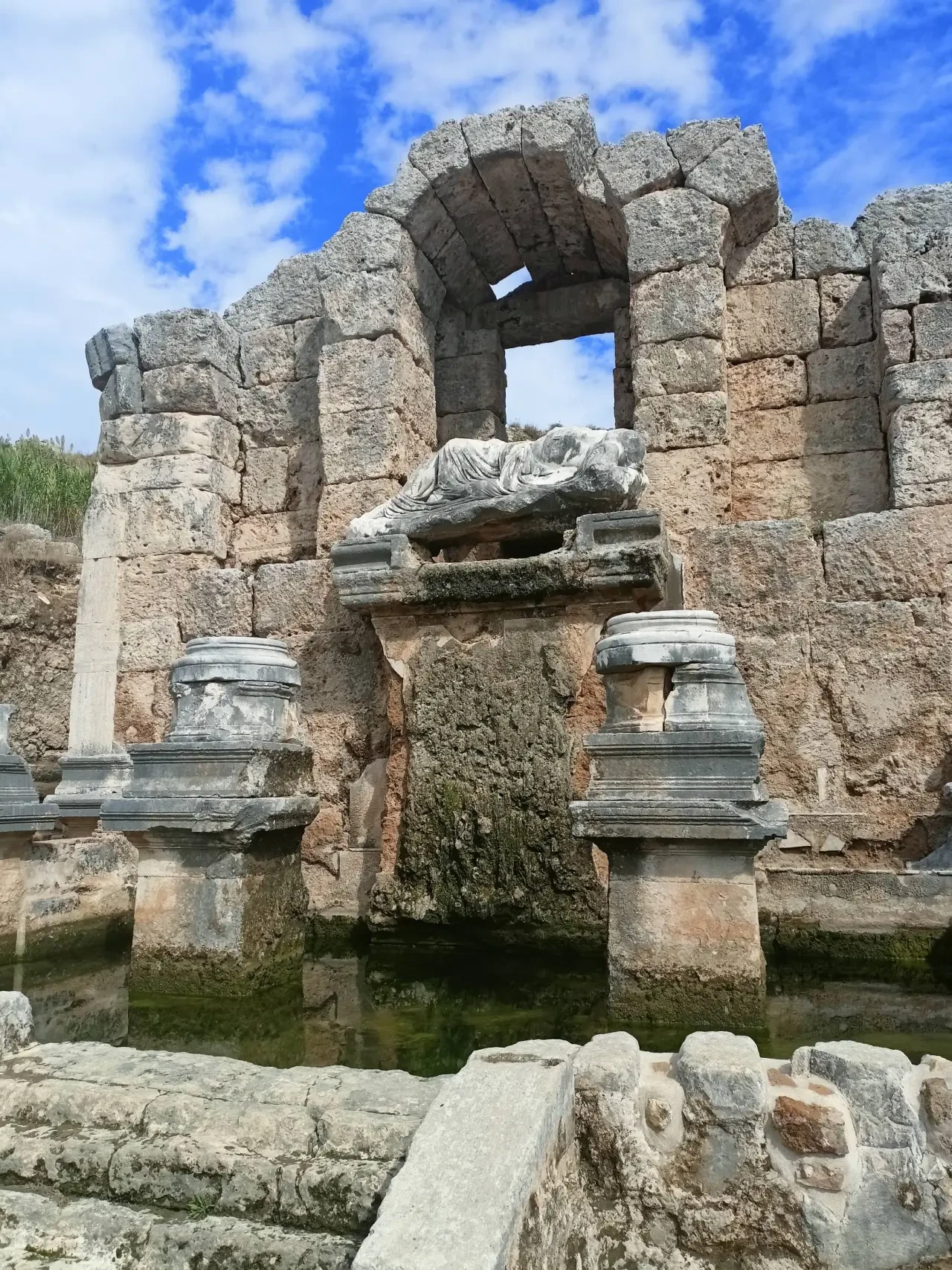 Поскольку город стоял на реке, его центральная улица заканчивалась «нимфеем», построенным в эпоху императора Адриана. Это было святилище, посвящённое нимфам. Обычно они сооружались у источника воды или водоёма. За нимфеем Перге начинается подъём на холм, где располагался акрополь. Вот только его сооружения сохранились плохо.