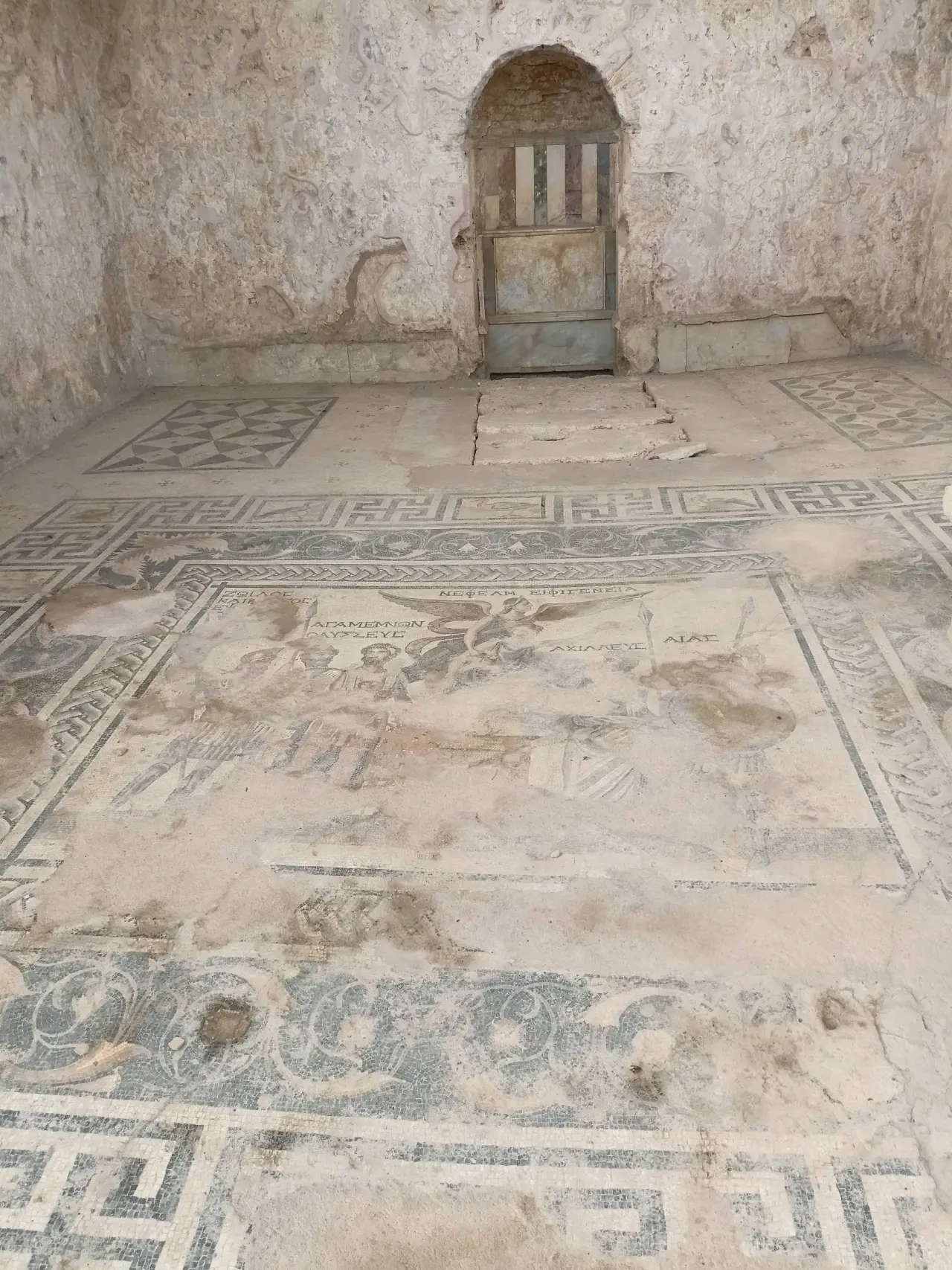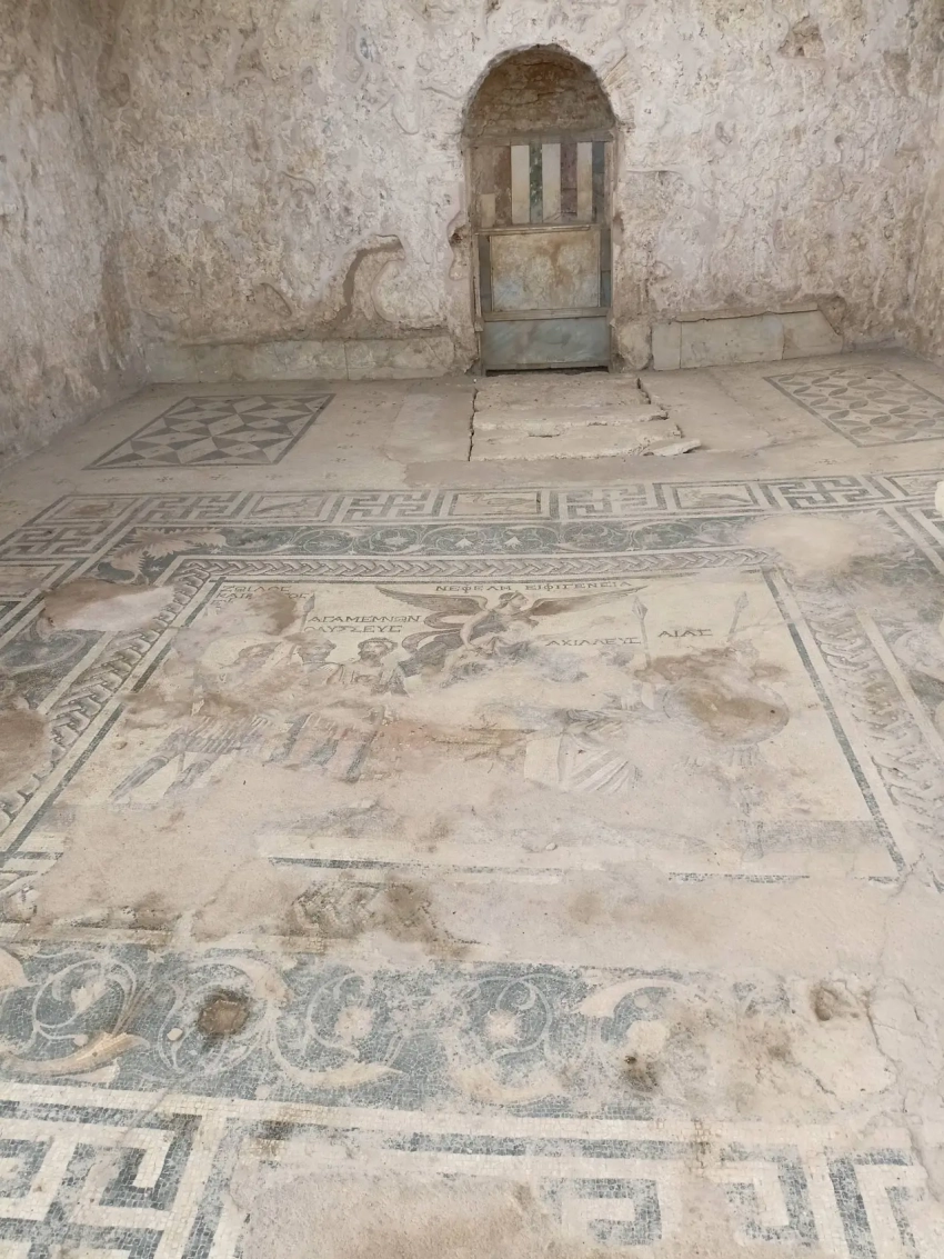 А вот это напольная мозаика с изображением героев Троянской войны, Агамемнона, Одиссея, Ахиллеса и Аякса в одном из раскопанных зданий. Понятно, что ходить по ней запрещено