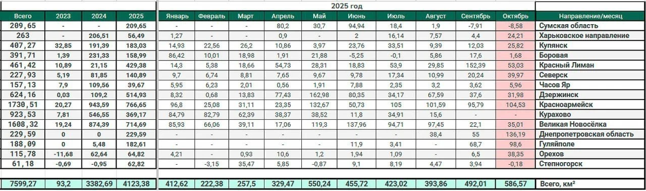 Юрий Подоляка в новой сводке от 03.11.2025 сообщил о том, в октябре ВС РФ освободили более 500 кв км территории
