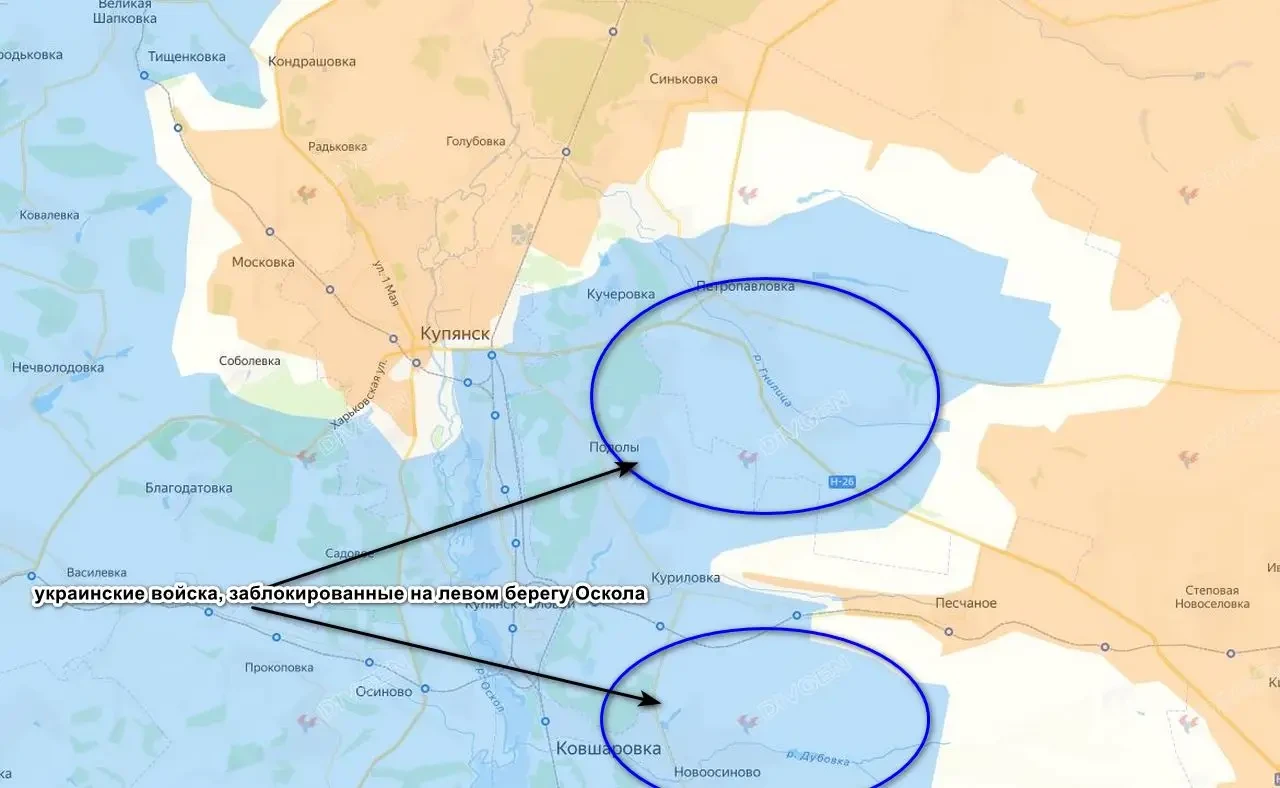 По данным военного ведомства, за последние сутки противник предпринял две попытки разблокировать окруженную группировку ВСУ на левом берегу реки Оскол, проведя контратаки. По данным от российских ресурсов, командующий группировкой генерал Драпатый стянул в район Купянска серьезные силы, пытаясь вытащить формирования ВСУ с района Петропавловки и Кучеровки. Самое удобное место для наведения переправ — это район Купянска-Узлового, но навести их не дают ВС РФ, нанося удары дронами и ФАБами.
