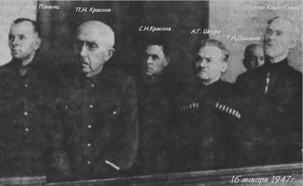 Андрей Шкуро, Петр Краснов и его двоюродный племянник Семен Краснов, походный атаман нацистского Казачьего стана Тимофей Доманов, командир горских частей в составе казачьего корпуса Краснова Султан Клыч-Гирей и Гельмут фон Паннвиц были приговорены к смертной казни через повешение. Приговор был приведён в исполнение 16 января 1947 года.