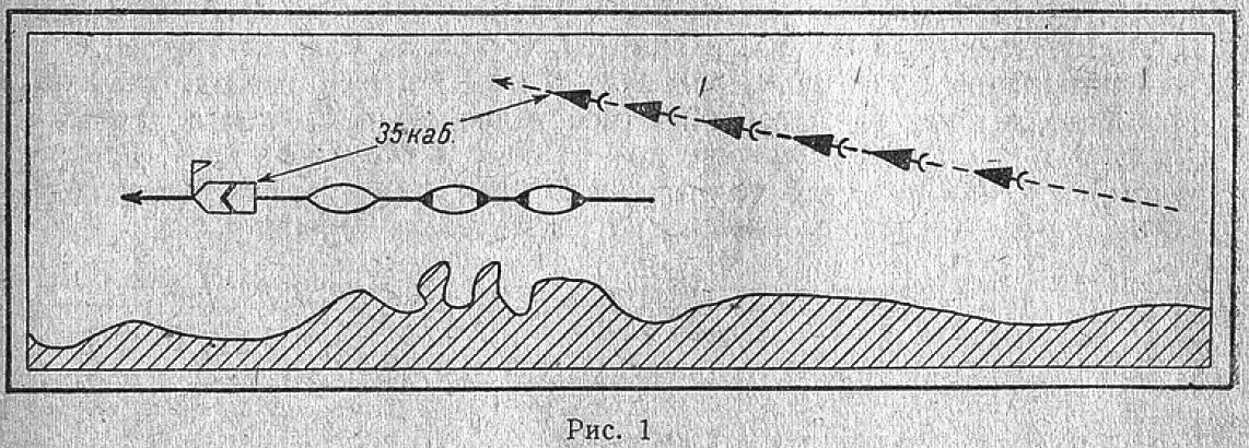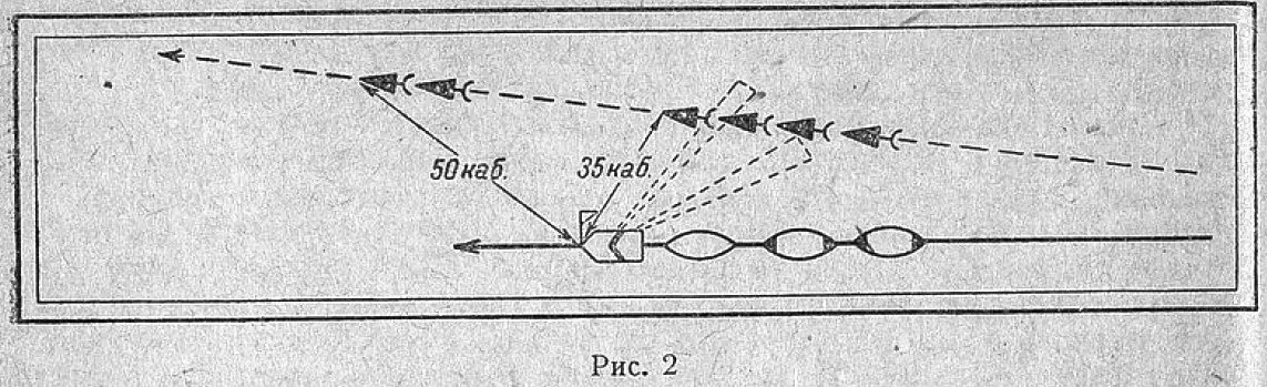 Кроме того, постановка дымовых завес производилась одновременно с двух торпедных катеров. Интересным является также изменение дистанций в строе кильватера. Переход совершался в строе кильватера на дистанциях, больше нормальных. При появлении же опасности строй смыкался (дистанция в этом случае меньше нормальной). Это, по всей вероятности, является узаконенным маневром во время перехода. Малые хода и глушители применялись, по-видимому, для уменьшения возможности обнаружения.