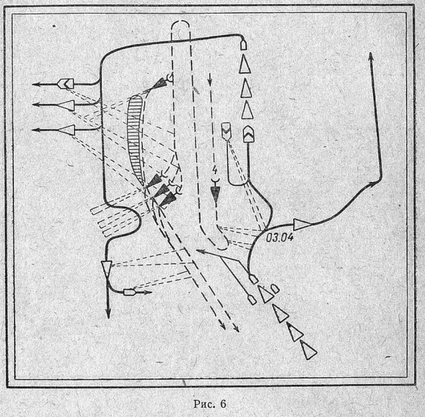 Два наших катера МО из охранения в момент атаки контратаковали катера противника артиллерийским огнем. Вскоре наши корабли были снова внезапно атакованы торпедными катерами неприятеля. Катера атаковали на этот раз головной и концевой эскадренные миноносцы на курсовом угле 140-150° левого борта с дистанции 4-3 кабельтовых. Головной миноносец, уклоняясь от торпед, повернул влево. Торпеды прошли с обоих бортов вплотную, не задев корабля. Все остальные корабли уклонились вправо, открыв ураганный огонь по вражеским торпедным катерам (рис. 6).