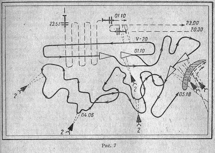 В 23 час. 55 мин. снова появился самолет-разведчик, который начал летать над кораблями на высоте 150-200 м. Миноносцы открыли зенитный огонь, но самолет пролетел перпендикулярно курсу кораблей и включил бортовые огни. Так он сделал пять галсов над кораблями, а на шестом заходе, в 1 час 10 мин., миноносцы были неожиданно атакованы торпедными катерами противника. Видимость была 3-4 кабельтовых, луна в это время зашла за горизонт (рис. 7).