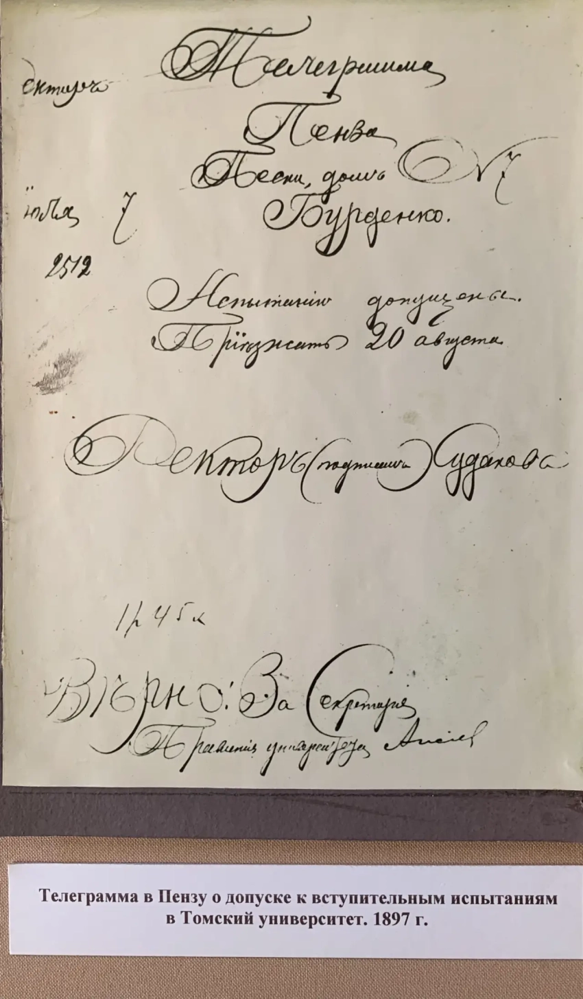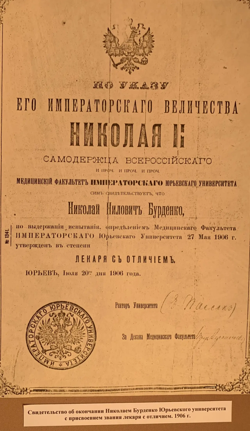 А дальше было так, что хотя некую бумагу на фотографии Николай и подписал, но… участие в забастовке студентов в 1899 г. все-таки принял и был исключен из университета. Однако подал прошение о восстановлении и снова вернулся в университет. В 1901 году его имя снова появилось в списке забастовщиков, по некоторым сведениям, попало оно туда случайно. Однако Бурденко был все же вынужден покинуть Томск и 11 октября 1901 года перевестись… в Юрьевский университет (ныне университет в городе Тарту, Эстония) на четвёртый курс медицинского факультета. Там, видимо, было «посвободнее». Но отметим и тот факт, что не так уж и сильно царизм преследовал молодых бунтовщиков. Возможность учиться для них он не закрывал…