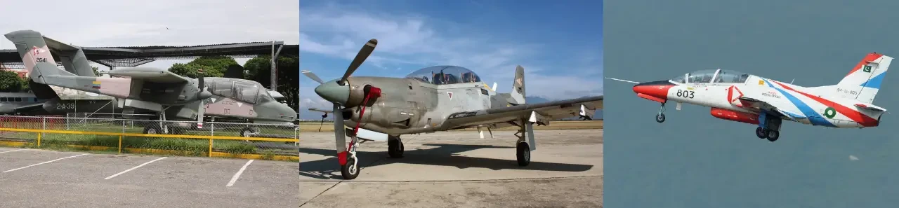 Прочая авиационная техника ВВС Венесуэлы – это 4 лёгких штурмовика Rockwell OV-10A/E Bronco, 32 учебно-транспортных самолёта (УТС) Embraer EMB 312 Tucano и 18 реактивных УТС K-8W Karakorum китайского производства. Может эффективно использоваться в рамках противопартизанских действий, но, разумеется, не в условиях господства в воздухе авиации противника.