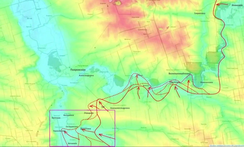Севернее российские бойцы прорывают рубеж реки Гайчур, наступая на Герасимовку и Остаповское (где уже идут бои), а также частично заняли Отрадное. Выход на рубеж Андреевка - Братское обеспечит левый фланг для масштабного наступления на Покровское.