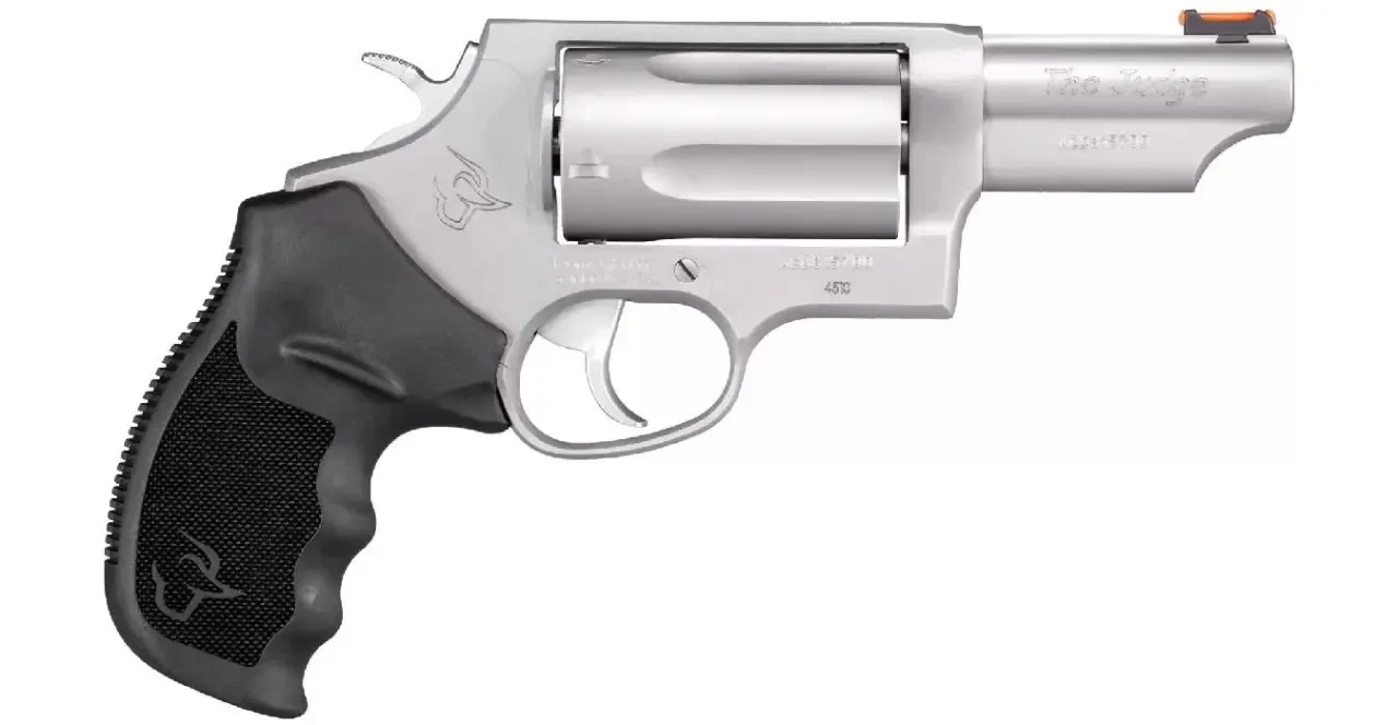 «Таурус» – «Судья». Револьвер со стволом 76-мм. Этот удивительный комбинированный револьвер способен использовать как дробовые патроны калибра .410, так и патроны .45 Кольт, идеально подходит для стрельбы на короткие дистанции, где чаще всего происходят стычки, или на большие дистанции, если стрелять патронами .45. Компания «Таурус» разработала такую нарезку, что она рассеивает дробь на близком расстоянии, но вот пулю .45 калибра направляет точно в цель