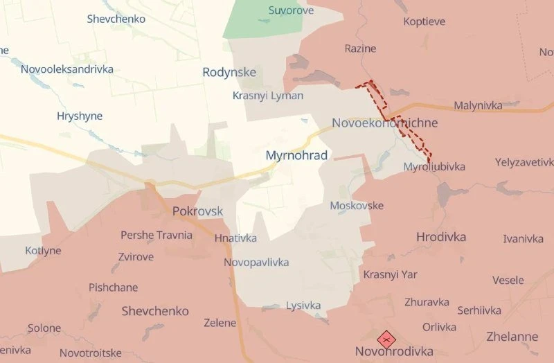 DeepState фиксирует, что под контролем ВСУ остаётся лишь узкая полоса к северу от Мирнограда. Это косвенно подтверждает, что логистика для украинского гарнизона крайне затруднена, даже если формального «котла» пока нет.