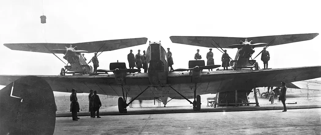 И-4 крепились в трех точках, на крыло истребители закатывали по деревянным помостам вручную, что делом было весьма непростым. Взлетало это сооружение при работе моторов всех самолетов на полном газу.
